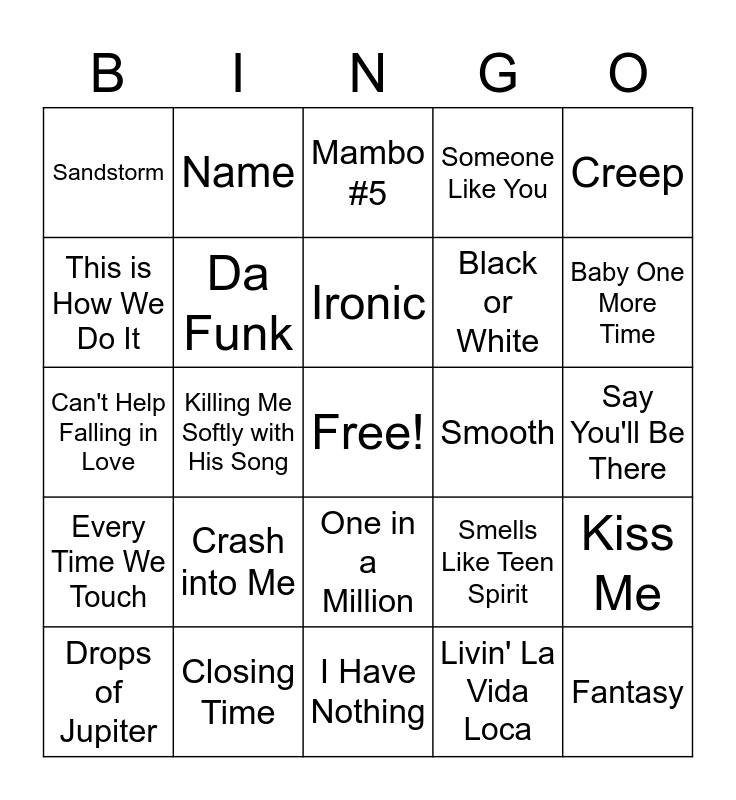 This bingo card has a free space and 24 words: Crash into Me, Closing Time, Ironic, Drops of Jupiter, Creep, Sandstorm, This is How We Do It, Name, Smooth, One in a Million, Black or White, Can't Help Falling in Love, Smells Like Teen Spirit, Kiss Me, Da Funk, Livin' La Vida Loca, Say You'll Be There, Mambo #5, Baby One More Time, Killing Me Softly with His Song, Fantasy, Every Time We Touch, Someone Like You and I Have Nothing.