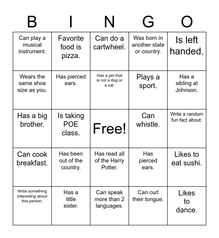 This bingo card has a free space and 24 words: Has been out of the country., Has a little sister., Has a pet that is not a dog or a cat., Write something interesting about this person., Is left handed., Can play a musical instrument., Wears the same shoe size as you., Favorite food is pizza., Can whistle., Has read all of the Harry Potter., Plays a sport., Has a big brother., Has pierced ears., Likes to eat sushi., Has pierced ears., Can curl their tongue., Write a random fun fact about:, Can do a cartwheel., Has a sibling at Johnson., Is taking POE class., Likes to dance., Can cook breakfast., Was born in another state or country. and Can speak more than 2 languages..