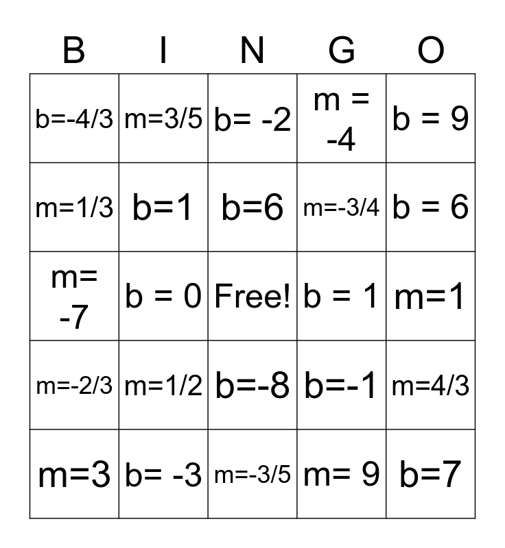 This bingo card has a free space and 24 words: m=1/2, b= -3, b=6, m=3, b = 9, b=-4/3, m=1/3, m=3/5, b = 1, b=-8, m=-3/4, m= -7, b=-1, m=4/3, b=1, m= 9, m=1, b= -2, b = 6, b = 0, b=7, m=-2/3, m = -4 and m=-3/5.