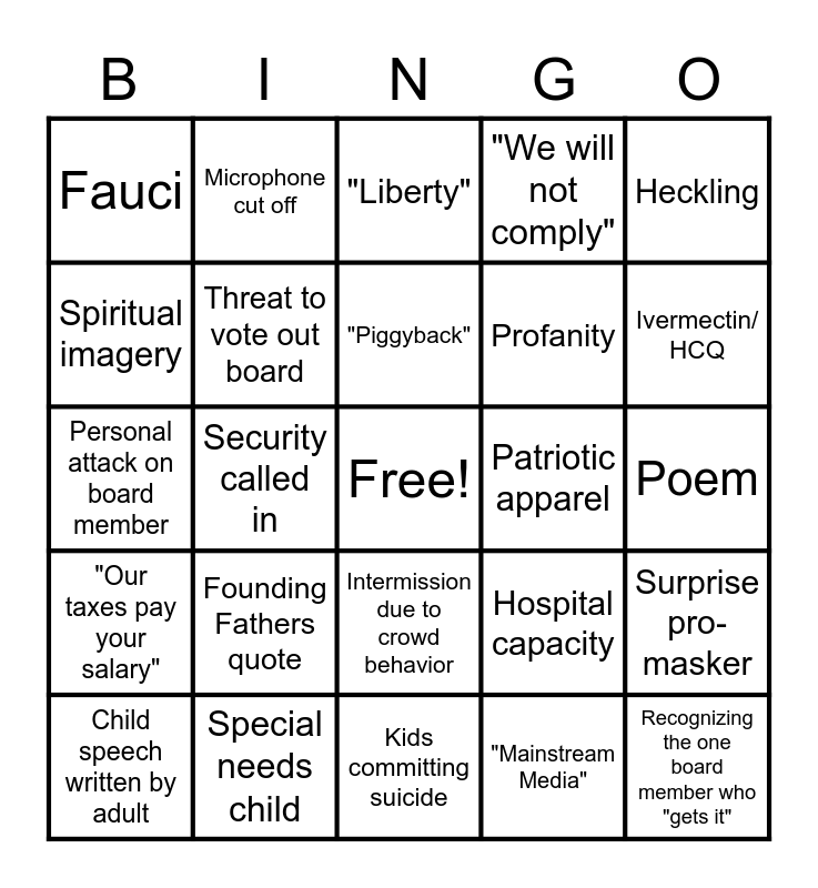 This bingo card has a free space and 24 words: Child speech written by adult, Founding Fathers quote, "Piggyback", "Mainstream Media", Heckling, Fauci, Microphone cut off, "Liberty", Patriotic apparel, Poem, Personal attack on board member, Threat to vote out board, Hospital capacity, Surprise pro-masker, Spiritual imagery, Special needs child, Kids committing suicide, "We will not comply", Ivermectin/ HCQ, "Our taxes pay your salary", Security called in, Intermission due to crowd behavior, Profanity and Recognizing the one board member who "gets it".