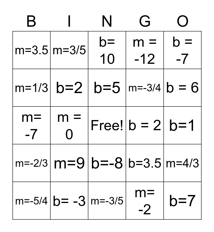 This bingo card has a free space and 24 words: m=9, b= -3, b=5, m=-5/4, b = -7, m=3.5, m=1/3, m=3/5, b = 2, b=-8, m=-3/4, m= -7, b=3.5, m=4/3, b=2, m= -2, b=1, b= 10, b = 6, m = 0, b=7, m=-2/3, m = -12 and m=-3/5.