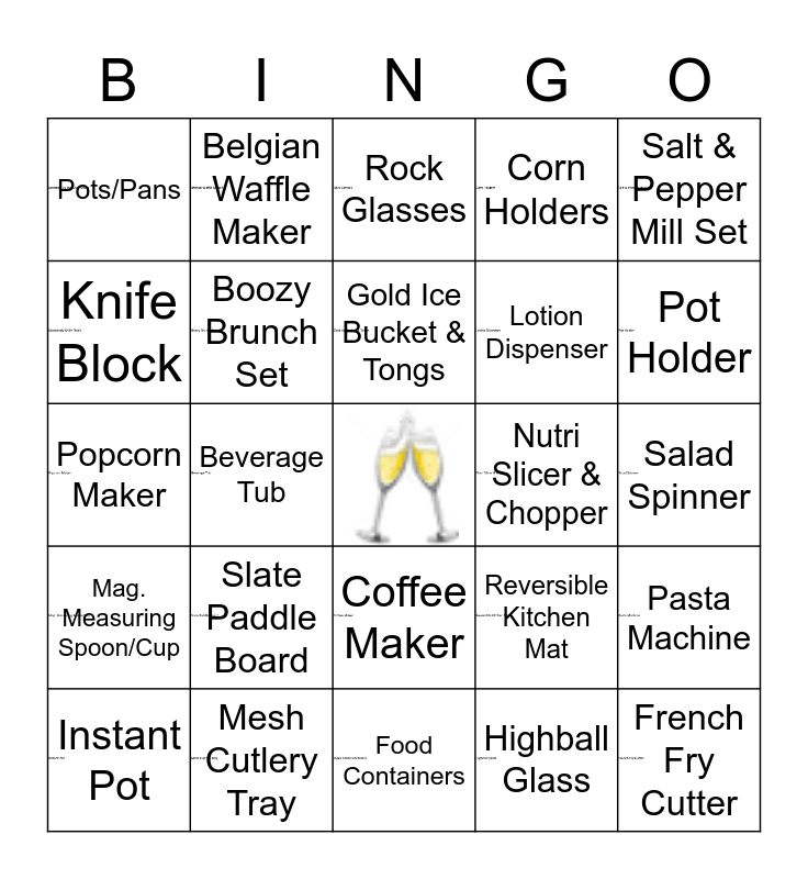This bingo card has 29 images, a free space and 29 words: Mini Food Processor, Mesh Cutlery Tray, Rock Glasses, Coupe Cocktail Glasses, Salt & Pepper Mill Set, Pots/Pans, Boozy Brunch Set, Gold Ice Bucket & Tongs, Nutri Slicer & Chopper, Pasta Machine, Instant Pot, Beverage Tub, Highball Glass, French Fry Cutter, Popcorn Maker, Oil Bottle, Food Containers, Reversible Kitchen Mat, Pot Holder, Mag. Measuring Spoon/Cup, Slate Paddle Board, Cotton Hand/Bath Towel, Lotion Dispenser, Salad Spinner, Knife Block, Belgian Waffle Maker, Coffee Maker, Corn Holders and Toaster Oven.