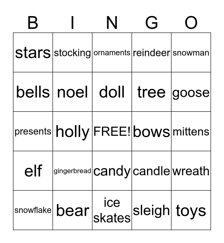 This bingo card has a free space and 26 words: candy, sleigh, doll, bear, snowman, stars, bells, stocking, mittens, candle, tree, presents, wreath, snowflake, holly, santa, reindeer, elf, ornaments, toys, goose, ice skates, bows, gingerbread, noel and holiday.
