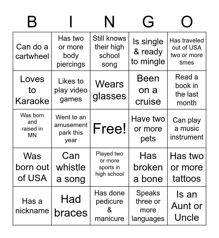 This bingo card has a free space and 24 words: Can whistle a song, Had braces, Wears glasses, Has a nickname, Has traveled out of USA two or more times, Can do a cartwheel, Loves to Karaoke, Has two or more body piercings, Have two or more pets, Played two or more sports in high school, Been on a cruise, Was born and raised in MN, Has broken a bone, Has two or more tattoos, Likes to play video games, Speaks three or more languages, Can play a music instrument, Still knows their high school song, Read a book in the last month, Went to an amusement park this year, Is an Aunt or Uncle, Was born out of USA, Is single & ready to mingle and Has done pedicure & manicure.