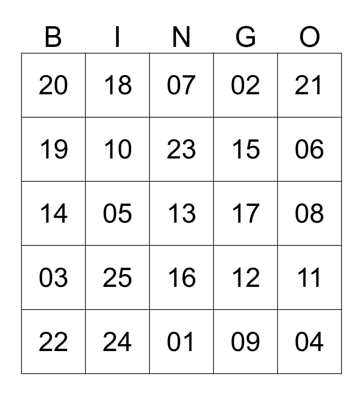 This bingo card has a free space and 24 words: 25, 24, 23, 22, 21, 20, 19, 18, 17, 16, 15, 14, 12, 11, 10, 09, 08, 07, 06, 05, 04, 03, 02 and 01.
