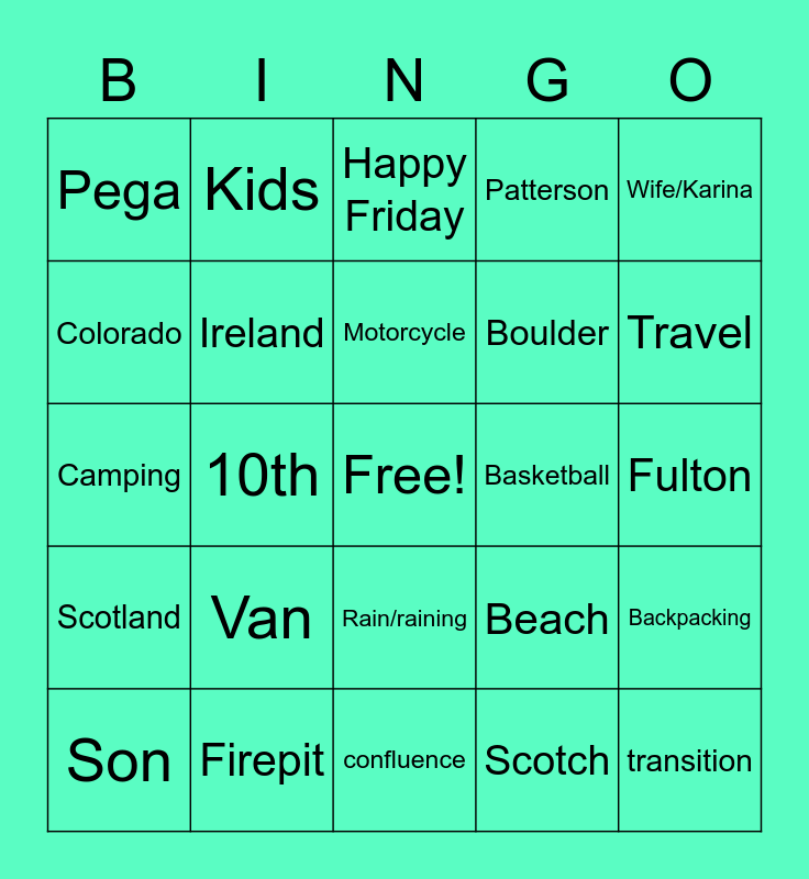 This bingo card has a free space and 34 words: Hike/hiking, Scotch, whiskey, Portland, Scotland, Ireland, Wife/Karina, Son, Kids, Amsterdam, Motorcycle, Happy Friday, Hello, hello, Trees, Basketball, Travel, Firepit, Camping, Van, Beach, Rain/raining, Boston, Pega, Fulton, confluence, transition, Patterson, HiveLive, Boulder, Colorado, September, 10th, Backpacking and Woods.