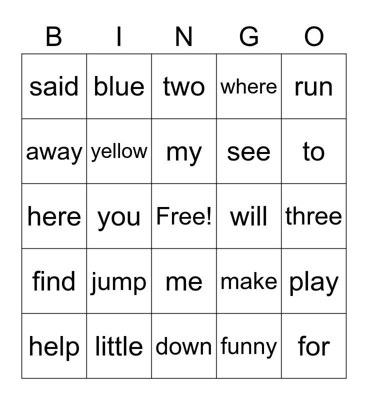 This bingo card has a free space and 24 words: jump, little, my, help, run, said, away, blue, will, me, see, here, make, play, yellow, funny, three, two, to, you, for, find, where and down.