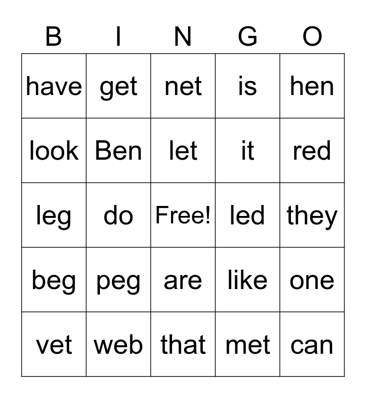This bingo card has a free space and 34 words: bed, met, men, pen, beg, Ben, hen, vet, get, ten, let, net, wet, den, led, red, web, leg, peg, like, are, we, have, they, that, can, is, the, it, look, my, do, one and two.
