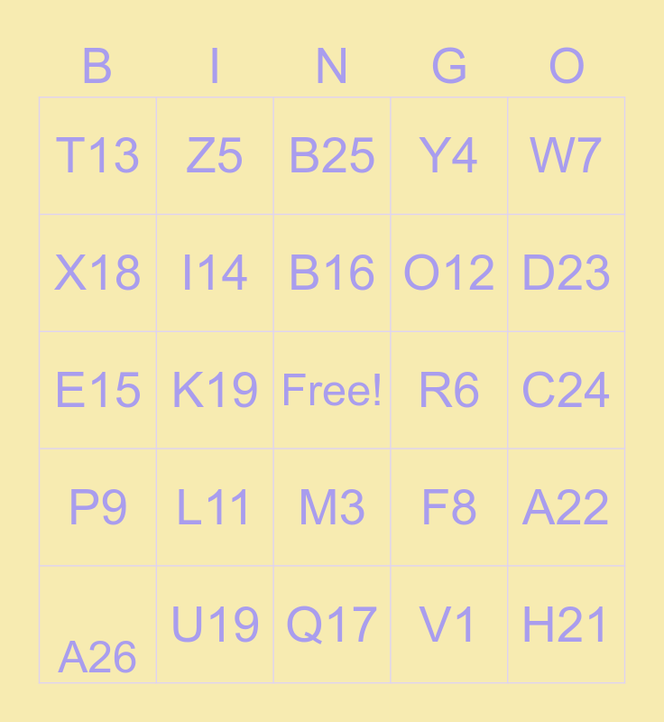This bingo card has a free space and 29 words: A26, J2, K19, S10, T13, B25, I14, L11, R6, U19, C24, H21, Q17, V1, D23, G16, M3, P9, W7, E15, F8, N20, O12, X18, Y4, Z5, A22, B16 and C25.