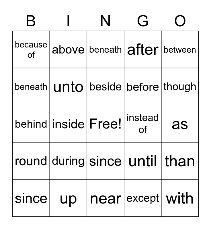 This bingo card has a free space and 156 words: about, above, across, after, along, against, amid, among, around, as, at, before, behind, below, beneath, beside, between, because of, by, down, during, except, for, from, in, into, inside, instead of, like, near, next to, of off, on, outside, out of, past, round, since, than, though, till, to, toward, under, underneath, until, unto, up, upon, without, with, within, about, above, across, after, along, against, amid, among, around, as, at, before, behind, below, beneath, beside, between, because of, by, down, during, except, for, from, in, into, inside, instead of, like, near, next to, of off, on, outside, out of, past, round, since, than, though, till, to, toward, under, underneath, until, unto, up, upon, without, with, within, about, above, across, after, along, against, amid, among, around, as, at, before, behind, below, beneath, beside, between, because of, by, down, during, except, for, from, in, into, inside, instead of, like, near, next to, of off, on, outside, out of, past, round, since, than, though, till, to, toward, under, underneath, until, unto, up, upon, without, with and within.