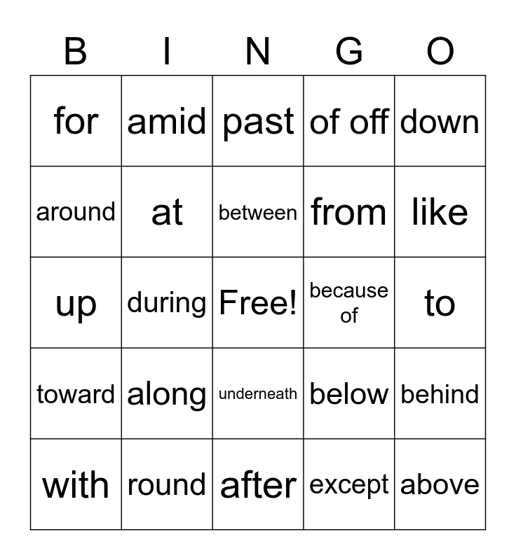 This bingo card has a free space and 52 words: about, above, across, after, along, against, amid, among, around, as, at, before, behind, below, beneath, beside, between, because of, by, down, during, except, for, from, in, into, inside, instead of, like, near, next to, of off, on, outside, out of, past, round, since, than, though, till, to, toward, under, underneath, until, unto, up, upon, without, with and within.