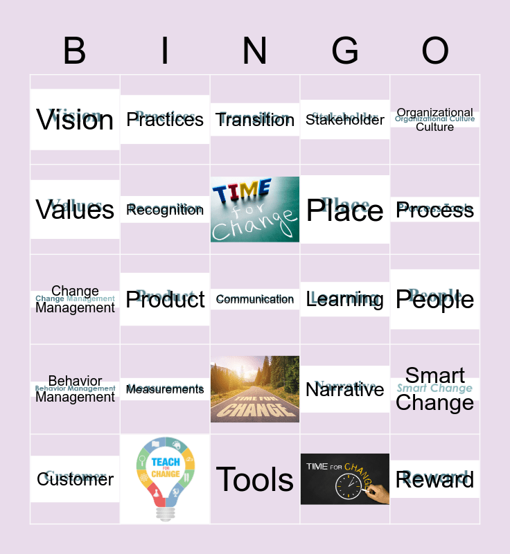This bingo card has 25 images and 22 words: Organizational Culture, Vision, Values, Practices, People, Narrative, Place, Change Management, Smart Change, Customer, Product, Competitor, Stakeholder, Behavior Management, Transition, Communication, Process, Tools, Learning, Measurements, Recognition and Reward.