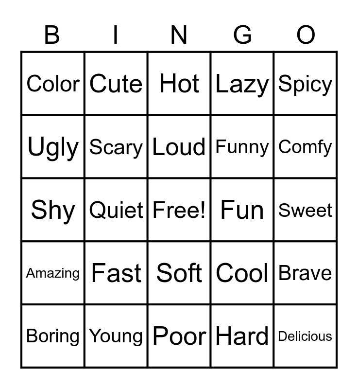 This bingo card has a free space and 24 words: Fast, Young, Loud, Boring, Spicy, Color, Ugly, Cute, Fun, Soft, Funny, Shy, Cool, Brave, Scary, Hard, Sweet, Hot, Comfy, Quiet, Delicious, Amazing, Lazy and Poor.