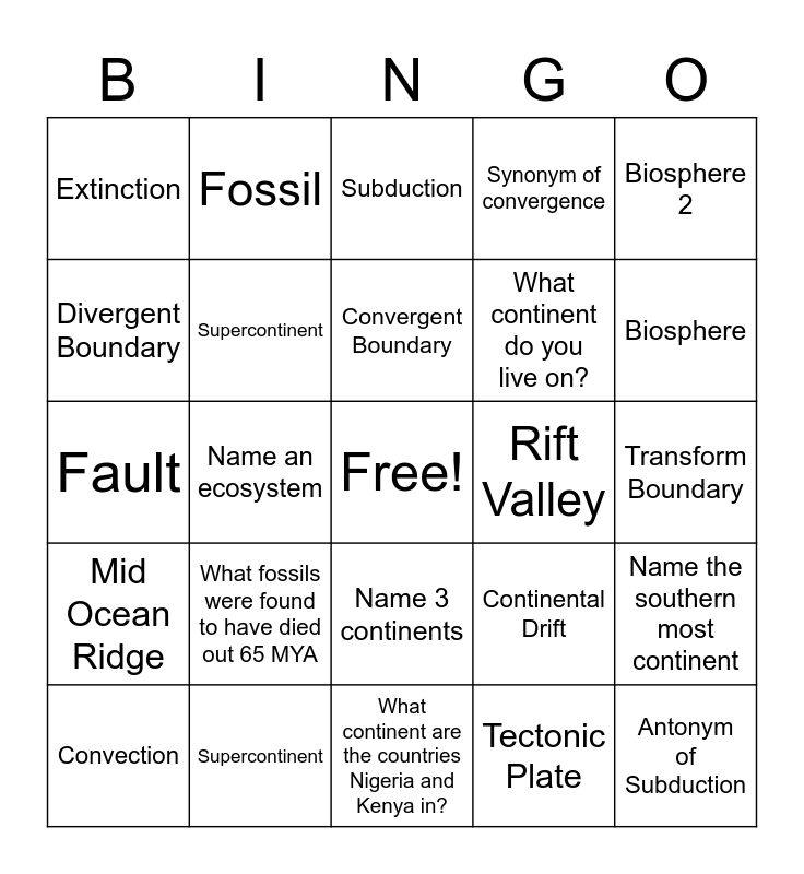 This bingo card has a free space and 24 words: What fossils were found to have died out 65 MYA, Supercontinent, Convergent Boundary, Convection, Biosphere 2, Extinction, Divergent Boundary, Fossil, Rift Valley, Name 3 continents, What continent do you live on?, Fault, Continental Drift, Name the southern most continent, Supercontinent, Tectonic Plate, Transform Boundary, Subduction, Biosphere, Name an ecosystem, Antonym of Subduction, Mid Ocean Ridge, Synonym of convergence and What continent are the countries Nigeria and Kenya in?.