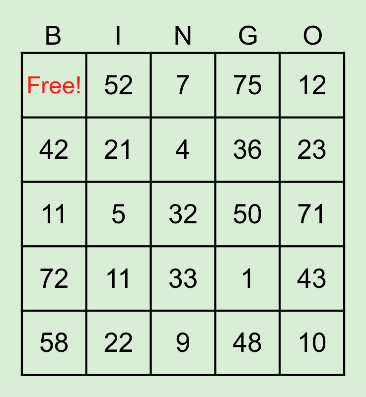 This bingo card has a free space and 24 words: 11, 22, 4, 58, 12, Free!, 42, 52, 50, 33, 36, 11, 1, 43, 21, 48, 71, 7, 23, 5, 10, 72, 75 and 9.