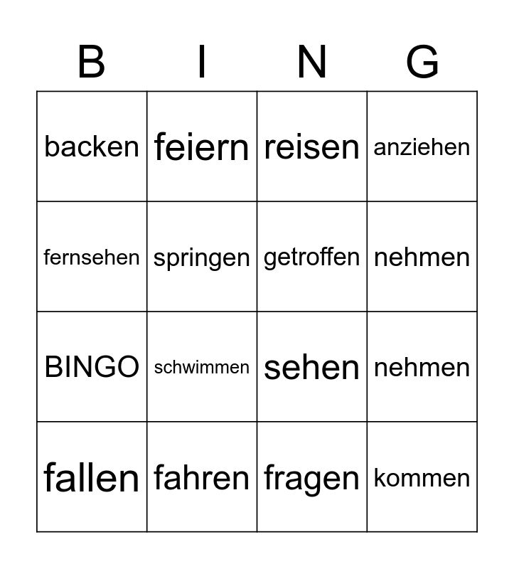 This bingo card has 20 words: nehmen, fliegen, reisen, sagen, fallen, fernsehen, fahren, backen, BINGO, feiern, schwimmen, sehen, springen, kommen, getroffen, wandern, nehmen, anziehen, fragen and geben.