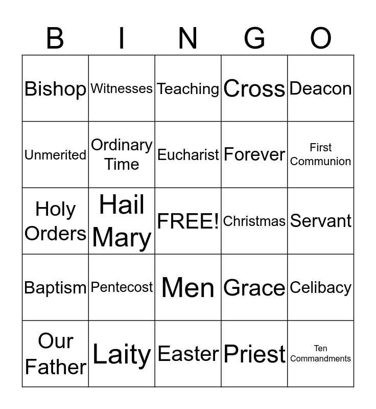 This bingo card has a free space and 26 words: Men, Priest, Eucharist, Laity, Deacon, Bishop, Unmerited, Witnesses, Servant, Grace, Forever, Holy Orders, Celibacy, Our Father, Hail Mary, Reconciliation, Cross, Baptism, Teaching, Ten Commandments, First Communion, Easter, Christmas, Pentecost, Ordinary Time and Advent.