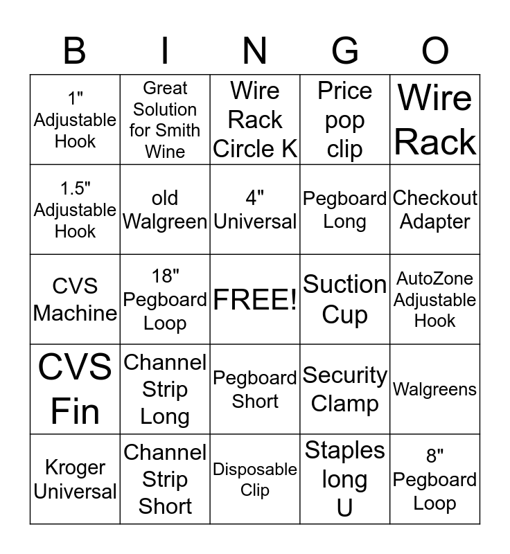 This bingo card has a free space and 24 words: Channel Strip Long, Channel Strip Short, 4" Universal, Kroger Universal, Wire Rack, 1" Adjustable Hook, 1.5" Adjustable Hook, Great Solution for Smith Wine, Suction Cup, Pegboard Short, Pegboard Long, CVS Machine, Security Clamp, Walgreens, old Walgreen, Staples long U, AutoZone Adjustable Hook, Wire Rack Circle K, Checkout Adapter, 18" Pegboard Loop, 8" Pegboard Loop, CVS Fin, Price pop clip and Disposable Clip.