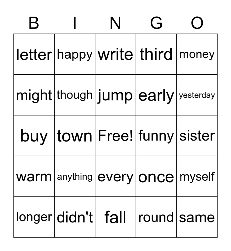 This bingo card has a free space and 24 words: anything, didn't, jump, longer, money, letter, might, happy, funny, every, early, buy, once, myself, though, round, sister, write, yesterday, town, same, warm, third and fall.