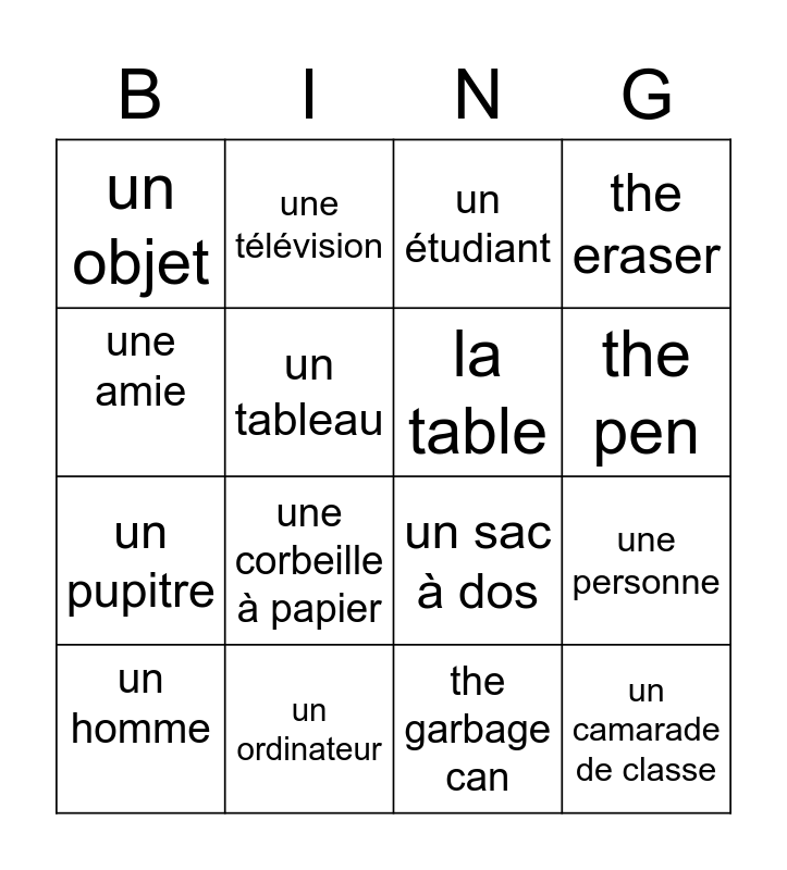 This bingo card has 20 words: une personne, un problème, un étudiant, une montre, un homme, une amie, un ordinateur, un objet, un pupitre, une télévision, une corbeille à papier, un sac à dos, un tableau, un camarade de classe, la table, la porte, the pen, the eraser, the garbage can and the chalkboard.