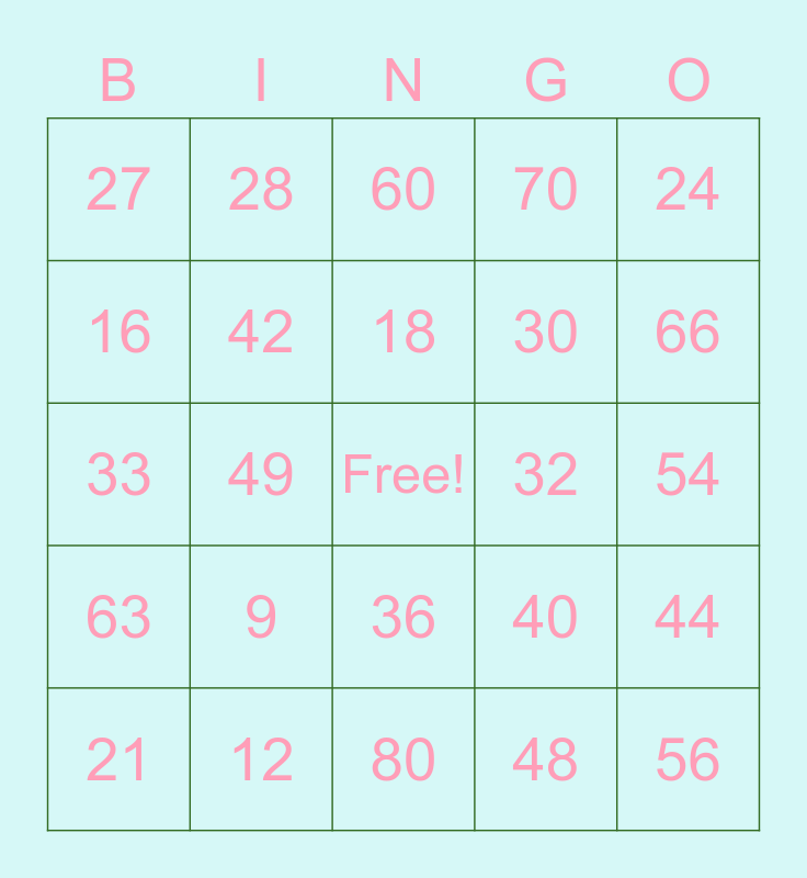 This bingo card has a free space and 24 words: 9, 12, 18, 21, 24, 27, 16, 28, 32, 36, 30, 33, 40, 44, 42, 48, 54, 60, 66, 49, 56, 63, 70 and 80.