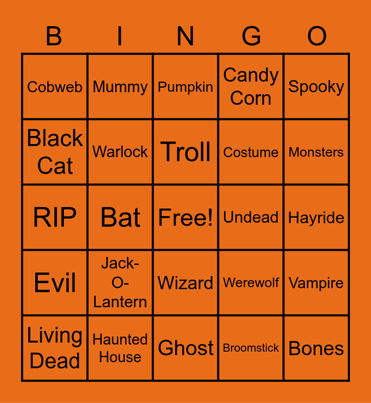 This bingo card has a free space and 46 words: Corpse, Bones, Goblin, Ghost, Jack-O-Lantern, Trick or Treat, Mummy, Hocus Pocus, Black Cat, Witch, Warlock, Candy Corn, Vampire, Werewolf, Zombie, Skeleton, Troll, Undead, Grim Reaper, Spooky, Bat, Broomstick, Cobweb, Costume, Casket, Monsters, Living Dead, Boogyman, Wizard, Evil, Eyeballs, Frighten, Devil, Ghost Story, Cauldron, Haunted House, Hayride, Grave Stone, Moonlight, Mask, Orange, Pumpkin, RIP, Scream, Skull and Spiders.