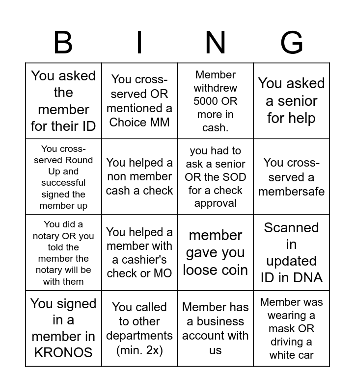 This bingo card has 20 words: Scanned in updated ID in DNA, cross-served any product RBFCU offers, Member withdrew 5000 OR more in cash., You helped a member longer then 5 minutes, You signed in a member in KRONOS, You cross-served Round Up and successful signed the member up, You called to other departments (min. 2x), You asked the member for their ID, You did a notary OR you told the member the notary will be with them, You cross-served OR mentioned a Choice MM, You helped a member with a cashier's check or MO, member gave you loose coin, You helped a non member cash a check, Member was wearing a mask OR driving a white car, you had to ask a senior OR the SOD for a check approval, You told the group chat you were going to lunch, You cross-served a membersafe, You asked a senior for help, Member has a business account with us and Member did a loan payment.
