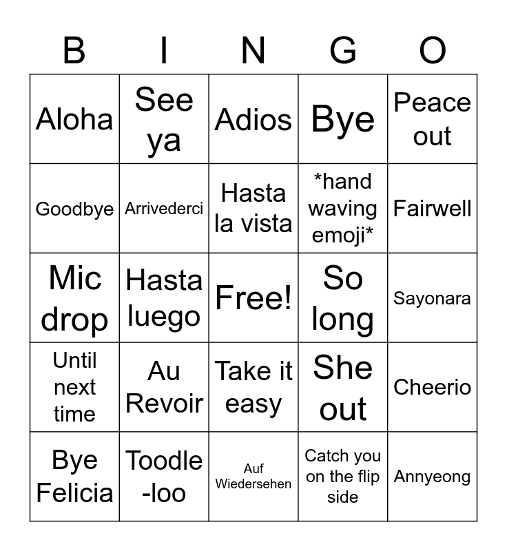 This bingo card has a free space and 29 words: Bye Felicia, Tata for now, Hasta luego, See you later alligator, Aloha, Adios, Arrivederci, Au Revoir, So long, Toodle -loo, Sayonara, Annyeong, Auf Wiedersehen, Catch you on the flip side, Fairwell, Baby, bye bye bye!, Take it easy, Until next time, Peace out, Mic drop, She out, Tot ziens, *hand waving emoji*, Goodbye, Bye, See ya, Cheerio, Hasta la vista and Keep it real.