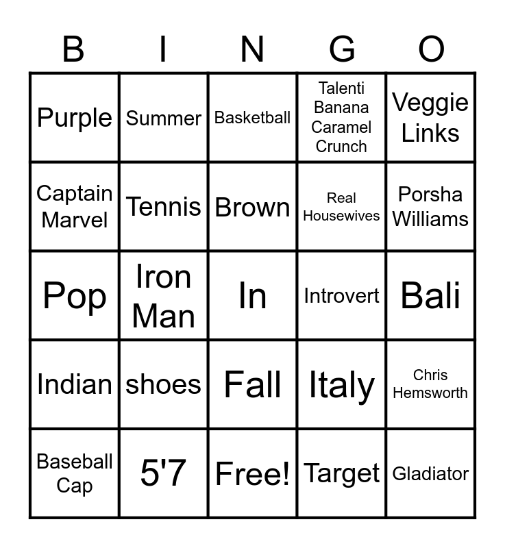 This bingo card has 26 words: Indian, 5'7, Brown, Target, Veggie Links, Purple, Tennis, Basketball, Real Housewives, Gladiator, Captain Marvel, Iron Man, Free!, Italy, Bali, 3, Summer, Fall, Talenti Banana Caramel Crunch, Chris Hemsworth, Pop, shoes, In, Introvert, Porsha Williams and Baseball Cap.