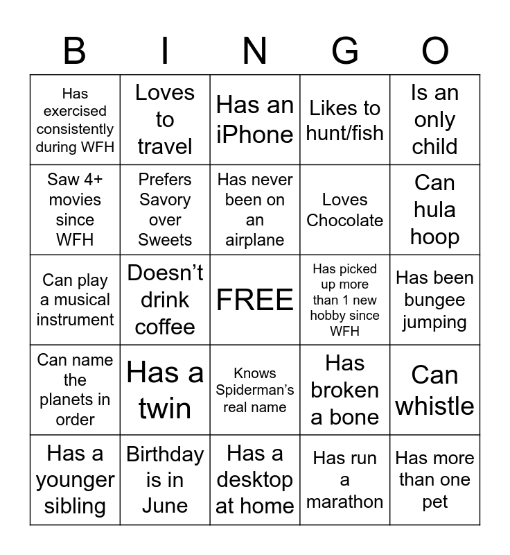 This bingo card has a free space and 53 words: Speaks more than 1 language, Has more than one pet, Has brown eyes, Has run a marathon, Has a twin, Doesn’t go by their first name, Loves to travel, Likes gardening, Saw 4+ movies since WFH, Enjoys reading, Prefers Savory over Sweets, Birthday is in July or August, Can whistle, Has broken a bone, Is left handed, Has a younger sibling, Has never been on an airplane, Has picked up more than 1 new hobby since WFH, Eats breakfast everyday, Is an only child, Doesn’t drink coffee, Loves Coke better than Pepsi, Loves Chocolate, Has exercised consistently during WFH, Is left handed, Birthday is in June, Has more than one pet, Runs their own business, Favorite season is Autumn, Can hula hoop, Sings karaoke, Favorite candy is Twix, Can blow a bubble, Can whistle, Can do a cartwheel, Grew up on a farm, Likes to hunt/fish, Has a desktop at home, Has an iPhone, Rides the bus/train to work, Has a nephew, Can remember when we didn’t have debit cards, Has been bungee jumping, Can say ABCs backwards, Has been to a haunted house, Knows Spiderman’s real name, Has been to Hawaii, Keeps a diary or journal, Can play a musical instrument, Can name the planets in order, Can name the colors of the rainbow in order, Can play chess and Can change a tire.