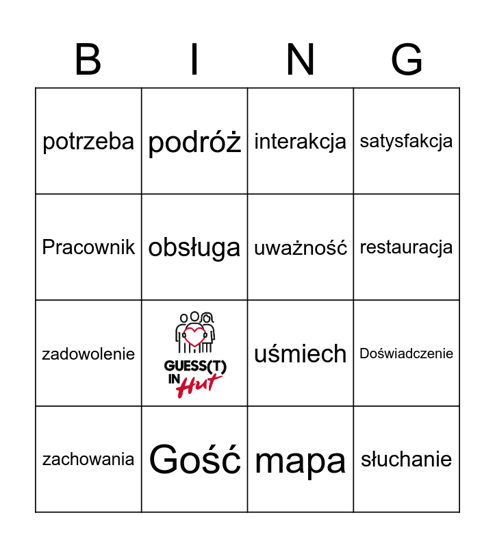 This bingo card has 1 images and 15 words: Gość, Doświadczenie, interakcja, potrzeba, zadowolenie, podróż, uśmiech, mapa, Pracownik, obsługa, zachowania, satysfakcja, restauracja, uważność and słuchanie.