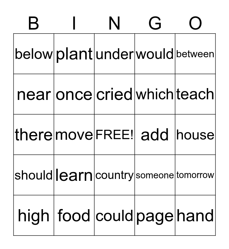This bingo card has a free space and 24 words: learn, food, cried, high, between, below, near, plant, add, country, which, there, someone, tomorrow, once, page, house, under, teach, move, hand, should, would and could.