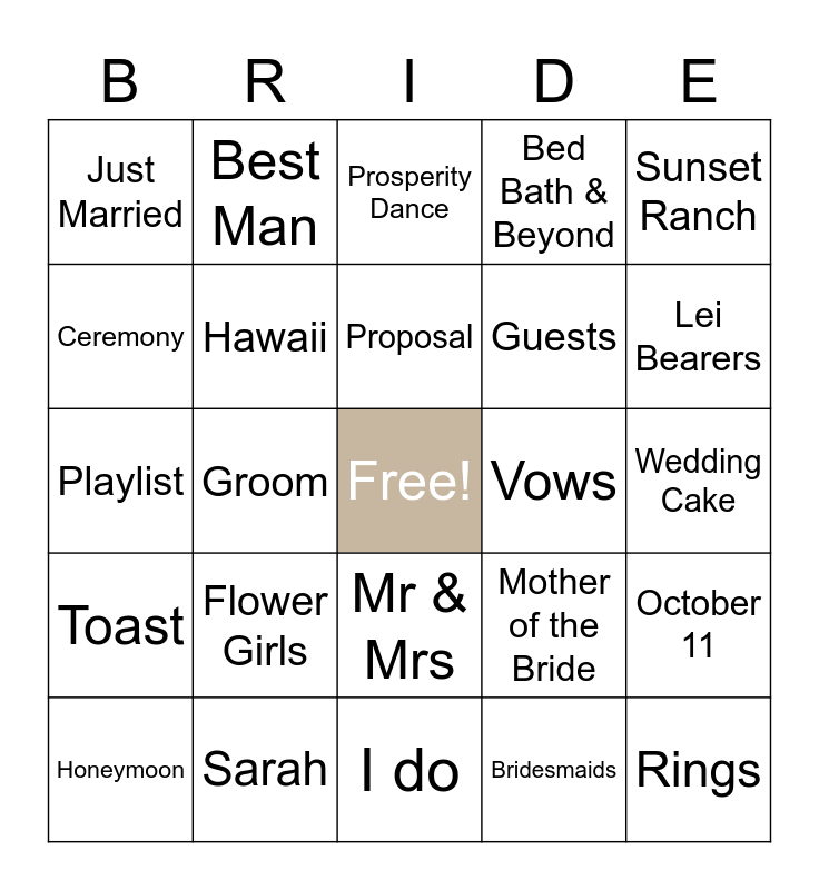 This bingo card has a free space and 24 words: Flower Girls, Sarah, Proposal, Honeymoon, Sunset Ranch, Just Married, Ceremony, Best Man, Vows, Mr & Mrs, Guests, Playlist, Mother of the Bride, October 11, Hawaii, Bridesmaids, Wedding Cake, Prosperity Dance, Lei Bearers, Groom, Rings, Toast, Bed Bath & Beyond and I do.