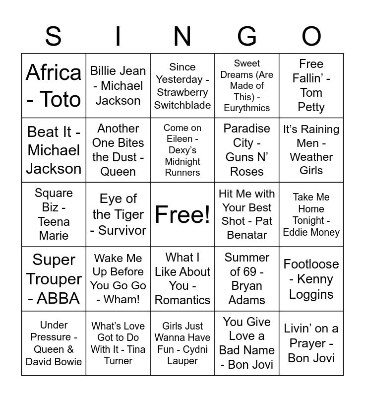 This bingo card has a free space and 48 words: I Wanna Dance With Somebody - Whitney Houston, Livin’ on a Prayer - Bon Jovi, Fast Car - Tracy Chapman, Girls Just Wanna Have Fun - Cydni Lauper, Wake Me Up Before You Go Go - Wham!, Don’t Stop Believin’ - Journey, Billie Jean - Michael Jackson, Never Gonna Give You Up - Rick Astley, Beat It - Michael Jackson, Pour Some Sugar on Me - Def Leppard, Another One Bites the Dust - Queen, Sweet Dreams (Are Made of This) - Eurythmics, Footloose - Kenny Loggins, Summer of 69 - Bryan Adams, Jessie’s Girl - Rick Springfield, Thriller - Michael Jackson, Come on Eileen - Dexy’s Midnight Runners, Hit Me with Your Best Shot - Pat Benatar, Any Way You Want It - Journey, Free Fallin’ - Tom Petty, Eye of the Tiger - Survivor, You Give Love a Bad Name - Bon Jovi, Africa - Toto, Paradise City - Guns N’ Roses, Tainted Love - Soft Cell, It’s Raining Men - Weather Girls, Under Pressure - Queen & David Bowie, Jack & Diane - John Cougar, What I Like About You - Romantics, Super Trouper - ABBA, You Make My Dreams (Come True) - Daryl Hall & John Oates, Edge of Seventeen - Stevie Nicks, Uptown Girl - Billy Joel, Material Girl - Madonna, What’s Love Got to Do With It - Tina Turner, Everybody Wants to Rule the World - Tears for Fears, Don’t You (Forget About Me) - Simple Minds, Take Me Home Tonight - Eddie Money, Bust a Move - Young MC, If I Could Turn Back Time - Cher, Express Yourself - Madonna, Kiss - Prince, Since Yesterday - Strawberry Switchblade, Let’s Dance - David Bowie, Square Biz - Teena Marie, Master Blaster (Jammin’) - Stevie Wonder, Love is a Battlefield - Pat Benatar and Every Breath You Take - The Police.