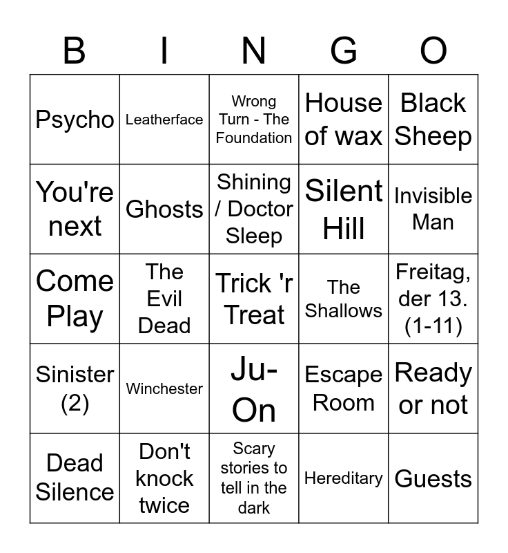 This bingo card has 59 words: Free!, Don't knock twice, Halloween (Filmreihe), Sinister (2), Hereditary, Don't Breathe, Ghosts, The Forest, Silent Hill, Final Destination (Filmreihe), House of wax, Das Ding (82), You're next, The ritual, Get Out, Psycho, Trick 'r Treat, Black Sheep, Tooth fairy, Shining / Doctor Sleep, The Shallows, Wrong Turn - The Foundation, Dead Silence, Ready or not, Freddy vs. Jason, Tucker & Dale vs. Evil, The Host, Friedhof der Kuscheltiere, Invisible Man, Quiet Place, The Cabin in the woods, Scream (Filmreihe), Green Room, The Reaping, Leatherface, Texas Chainsaw Massacre, Midsommar, The Evil Dead, Conjuring (3), Come Play, The Blair Witch Project, Winchester, Freitag, der 13. (1-11), Mama, Nightmare on the Elm Street, Alien (Filmreihe), Still, Predator, Ju-On, Scary stories to tell in the dark, Oculus, The Unholy, Braindead, Exists, The Empty Man, Escape Room, REC, Guests and Dead Silence.