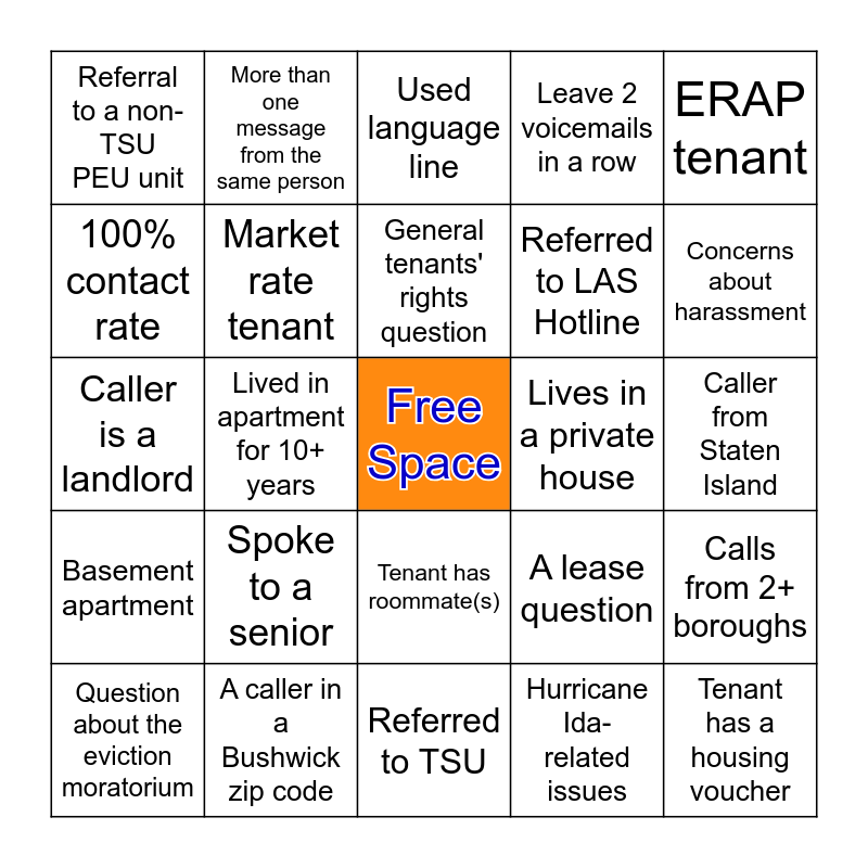 This bingo card has a free space and 24 words: Spoke to a senior, A caller in a Bushwick zip code, General tenants' rights question, Question about the eviction moratorium, ERAP tenant, Referral to a non-TSU PEU unit, 100% contact rate, More than one message from the same person, Lives in a private house, Tenant has roommate(s), Referred to LAS Hotline, Caller is a landlord, A lease question, Calls from 2+ boroughs, Market rate tenant, Hurricane Ida-related issues, Caller from Staten Island, Used language line, Concerns about harassment, Lived in apartment for 10+ years, Tenant has a housing voucher, Basement apartment, Leave 2 voicemails in a row and Referred to TSU.