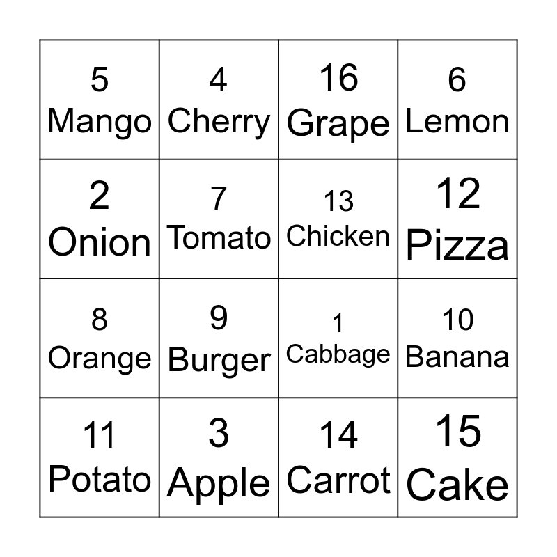 This bingo card has 16 words: 3 Apple, 10 Banana, 16 Grape, 5 Mango, 8 Orange, 4 Cherry, 1 Cabbage, 14 Carrot, 2 Onion, 7 Tomato, 11 Potato, 6 Lemon, 9 Burger, 12 Pizza, 13 Chicken and 15 Cake.