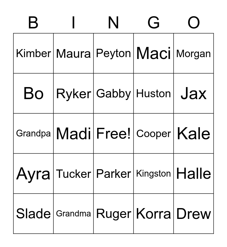 This bingo card has a free space and 37 words: Remi, Jay, Ryder, Ryker, Halle, Tucker, Gabby, Kayt, Morgan, Jordan, Madi, Maci, Drew, Kale, Bo, Ayra, Addie, Peyton, Parker, Cooper, Kimber, Jax, Slade, Ruger, Chloe, Korra, Maura, Maizy, Santa, Noah, Makayla, Grandma, Grandpa, Turkey, Kingston, Huston and Wade.