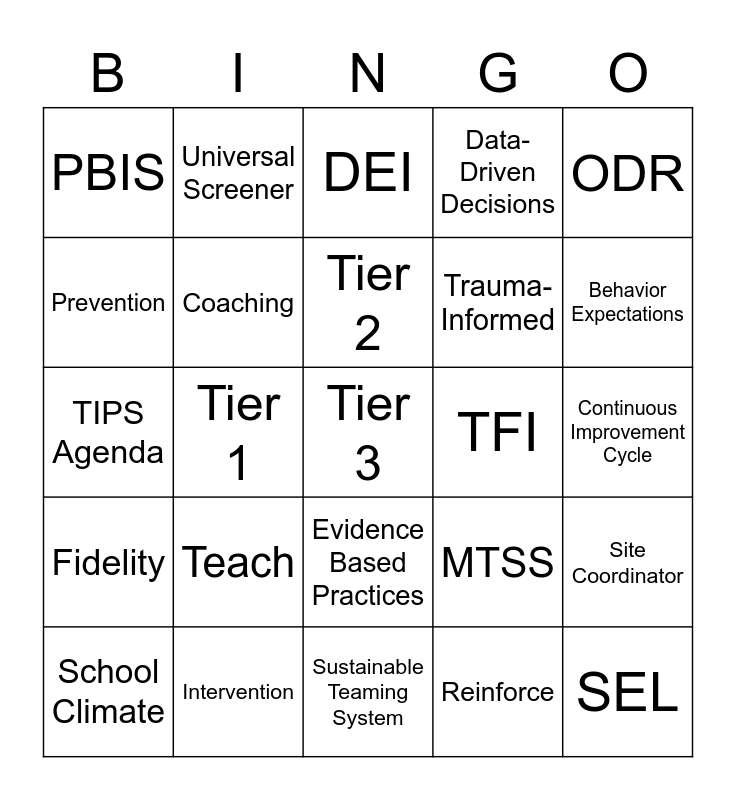 This bingo card has 25 words: Teach, Sustainable Teaming System, Tier 2, School Climate, ODR, PBIS, Prevention, Universal Screener, TFI, Evidence Based Practices, Trauma-Informed, TIPS Agenda, MTSS, Site Coordinator, Coaching, SEL, Continuous Improvement Cycle, DEI, Behavior Expectations, Tier 1, Tier 3, Intervention, Fidelity, Data-Driven Decisions and Reinforce.