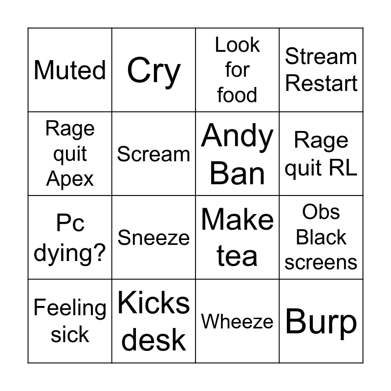 This bingo card has 23 words: Burp, Cat walks onto lap, Rage quit RL, Rage quit Val, Rage quit Apex, Muted, Scream, Cry, Feeling sick, Mum brings food, Sneeze, Pc dying?, Says Rat, Puts pillow on chair, Kicks desk, Fall off map in Apex, Look for food, Make tea, Andy Ban, Obs Black screens, Stream Restart, Wheeze and C*nt.