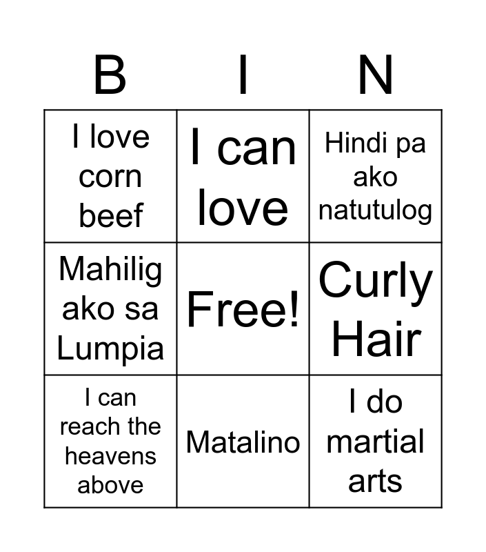 This bingo card has a free space and 8 words: Curly Hair, Hindi pa ako natutulog, I can love, I can reach the heavens above, I love corn beef, I do martial arts, Mahilig ako sa Lumpia and Matalino.