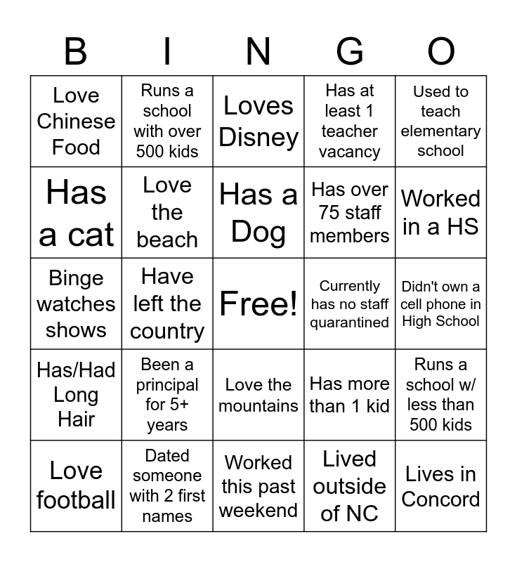 This bingo card has a free space and 24 words: Been a principal for 5+ years, Dated someone with 2 first names, Has a Dog, Love football, Used to teach elementary school, Love Chinese Food, Has a cat, Runs a school with over 500 kids, Currently has no staff quarantined, Love the mountains, Has over 75 staff members, Binge watches shows, Has more than 1 kid, Runs a school w/ less than 500 kids, Love the beach, Lived outside of NC, Didn't own a cell phone in High School, Loves Disney, Worked in a HS, Have left the country, Lives in Concord, Has/Had Long Hair, Has at least 1 teacher vacancy and Worked this past weekend.