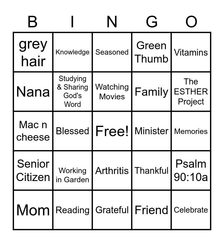 This bingo card has a free space and 24 words: Working in Garden, Reading, Watching Movies, Mom, Vitamins, grey hair, Nana, Knowledge, Minister, Arthritis, Family, Mac n cheese, Thankful, Psalm 90:10a, Studying & Sharing God's Word, Friend, Memories, Seasoned, The ESTHER Project, Blessed, Celebrate, Senior Citizen, Green Thumb and Grateful.