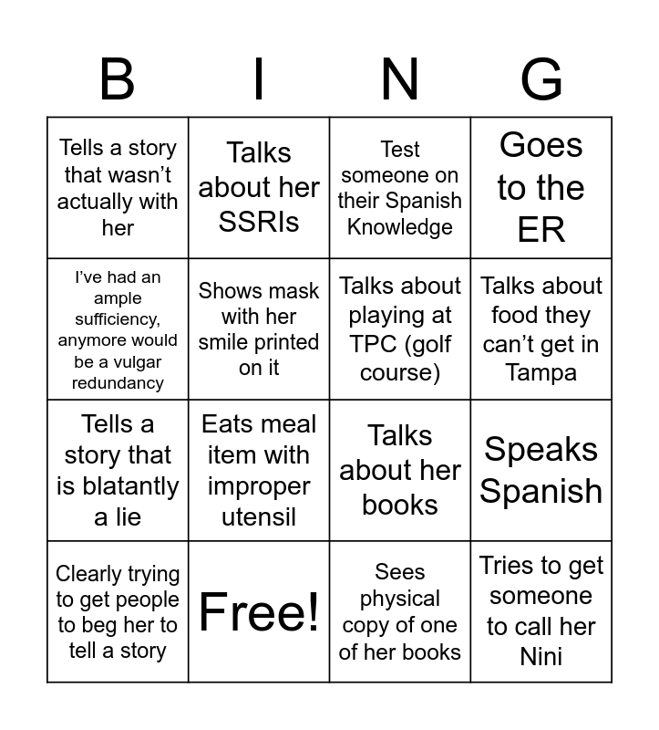 This bingo card has 16 words: Free!, Speaks Spanish, Test someone on their Spanish Knowledge, Tells a story that wasn’t actually with her, Tells a story that is blatantly a lie, Talks about her SSRIs, Talks about her books, Sees physical copy of one of her books, I’ve had an ample sufficiency, anymore would be a vulgar redundancy, Shows mask with her smile printed on it, Clearly trying to get people to beg her to tell a story, Goes to the ER, Eats meal item with improper utensil, Talks about food they can’t get in Tampa, Talks about playing at TPC (golf course) and Tries to get someone to call her Nini.