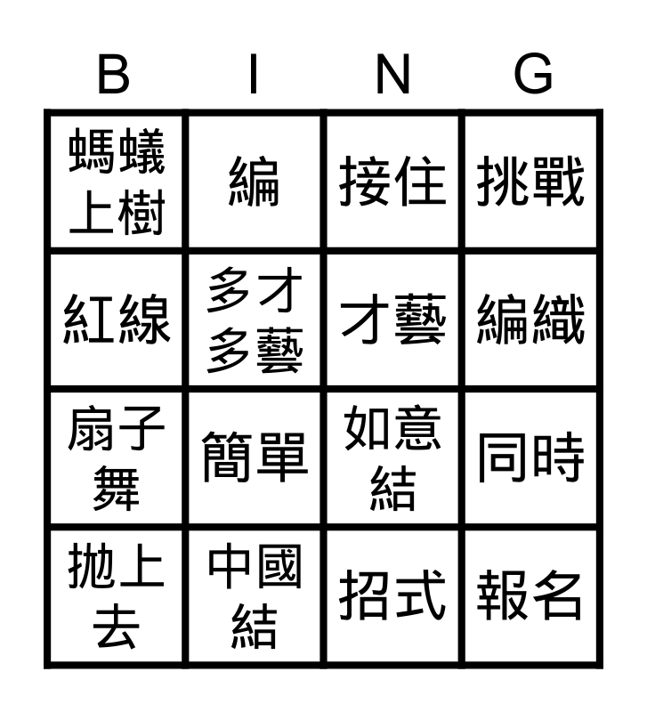 This bingo card has 17 words: 招式, 拋上去, 接住, 螞蟻 上樹, 簡單, 挑戰, 同時, 才藝, 編織, 多才 多藝, 中國結, 如意結, 紅線, 編, 扇子舞, 機會 and 報名.