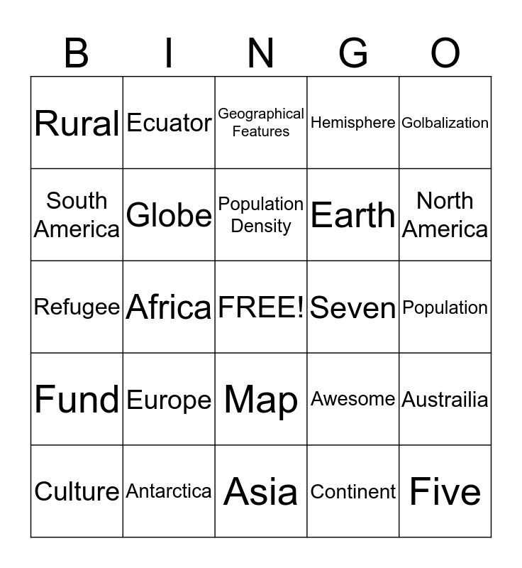 This bingo card has a free space and 24 words: Europe, Antarctica, Population Density, Culture, Golbalization, Rural, South America, Ecuator, Seven, Map, Earth, Refugee, Awesome, Austrailia, Globe, Continent, Population, Geographical Features, North America, Africa, Five, Fund, Hemisphere and Asia.