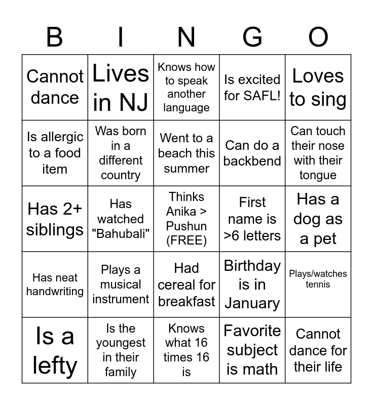 This bingo card has a free space and 24 words: Plays a musical instrument, Is the youngest in their family, Went to a beach this summer, Is a lefty, Loves to sing, Cannot dance, Is allergic to a food item, Lives in NJ, First name is >6 letters, Had cereal for breakfast, Can do a backbend, Has 2+ siblings, Birthday is in January, Plays/watches tennis, Was born in a different country, Favorite subject is math, Has a dog as a pet, Knows how to speak another language, Can touch their nose with their tongue, Has watched "Bahubali", Cannot dance for their life, Has neat handwriting, Is excited for SAFL! and Knows what 16 times 16 is.