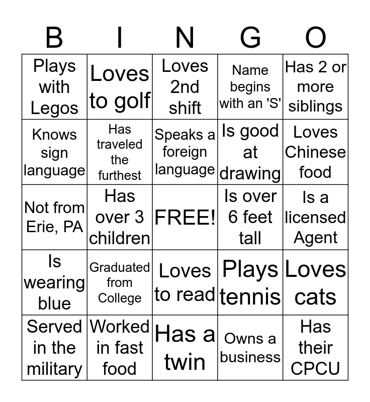 This bingo card has a free space and 36 words: Not born in the USA, Has 2 or more pets, Has green eyes, Has traveled the furthest, Plays tennis, Is wearing blue, Speaks a foreign language, Knows what a muntjak is, Has 2 or more siblings, Loves to ski, Has over 3 children, Name begins with an 'S', Likes to get up early, Is over 6 feet tall, Loves Chinese food, Plays with Legos, Worked here over 15 years, Graduated from College, Has their CPCU, Loves 2nd shift, Is a licensed Agent, Loves cats, Worked in fast food, Served in the military, Has a twin, Loves to golf, Not from Erie, PA, Family members work here, Is good at drawing, Knows sign language, Can do a cartwheel, Rides a bike to work, Owns a business, Loves to read, Hates to shop and Bought a car in 2015.
