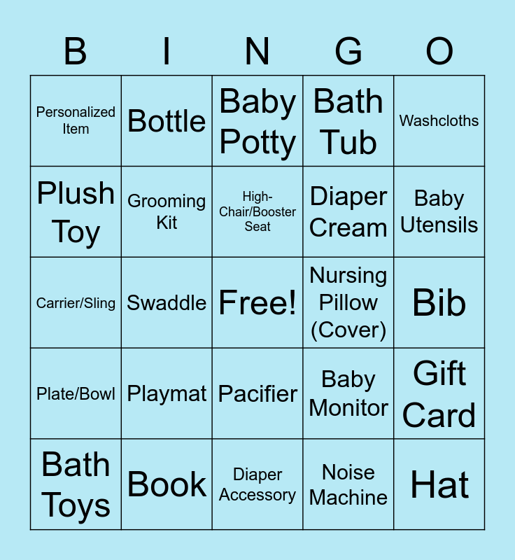 This bingo card has a free space and 35 words: Breast Pump/Shell, Complete Outfit, Milk Storage Bags, Grooming Kit, Pacifier, Bath Tub, Plush Toy, Onesie, High-Chair/Booster Seat, Nerdy/Geeky, Carrier/Sling, Washcloths, baby memory book, Humidifier, Personalized Item, Nursing Pillow (Cover), Noise Machine, Swaddle, Plate/Bowl, Hat, Baby Monitor, Bath Toys, Gift Card, Book, Baby Potty, Baby Utensils, Socks/Booties, Teether, Diaper Cream, Bib, Rattle, Diaper Accessory, Playmat, Bottle and Blanket.