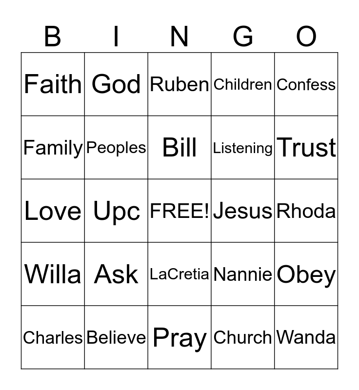 This bingo card has a free space and 24 words: Ask, Believe, Bill, Charles, Confess, Faith, Family, God, Jesus, LaCretia, Listening, Love, Nannie, Obey, Peoples, Church, Rhoda, Ruben, Trust, Upc, Wanda, Willa, Children and Pray.